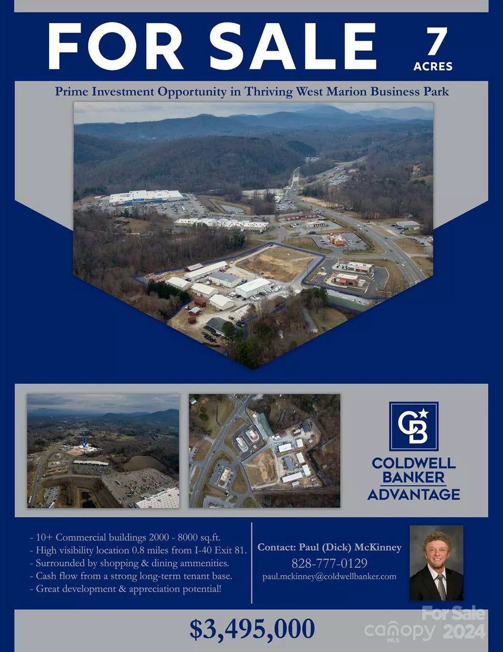 10 plus Intriguing, spacious Metal and Wood Buildings. Ranging from 2,000 to 8000 square feet, along with 3 smaller storage buildings and 3 larger sheds that could be finished into more rental space. Own your own Oasis. durability, low maintenance, flexibility, multiple sizes. Located in Marion Business Park on 7 +/- acres. Buildings are all leased except the office building that has a tenant waiting when seller removes personal items. The Listing price for buildings and land is lower than the lots sold with site work not done surrounding this property. Comparables right in the park will justify this. This is a great investment opportunity, many possibilities, one lot with over an acre ready to build on that backs up to Popeyes and coming Starbucks. Property could be renovated for large store facility, Motel and or Multi-tenant storage and or single user facilities. Zoned C-2, utilities available. 6 of the 10 buildings have air and heat, all have heat, office building has both.