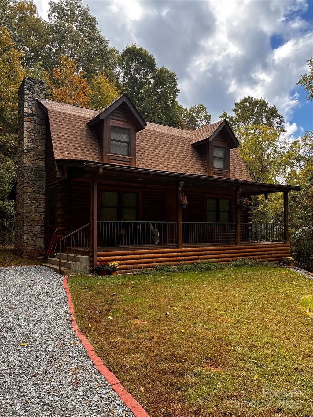 HERE IT IS! Your charming mountain cabin in the countryside. Located at 5 Rustic Ridge Dr, this quaint log home sits on a spacious, level, and private lot in a peaceful neighborhood near Asheville. The inviting full-length rocking chair porch welcomes you as you arrive. Inside, warm wood tones and beamed ceilings create a space that feels both expansive and cozy. The main level features a beautiful rock gas-log fireplace, a dining room, a kitchen with a portable island, and a guest half bath. Upstairs, there are 3 cozy bedrooms with angled ceilings adding character and a full bathroom. Each room has its own controlled baseboard heat, and the baseboards were recently cleaned. Filter on well has been changed monthly. Additional amenities include a backup generator to keep everything running smoothly during inclement weather. The nice level yard provides enough space outdoor activities and endless fun. With no restrictions, this property offers limitless possibilities for living, vacationing, or generating income. Don't miss out on this exceptional mountain retreat!
